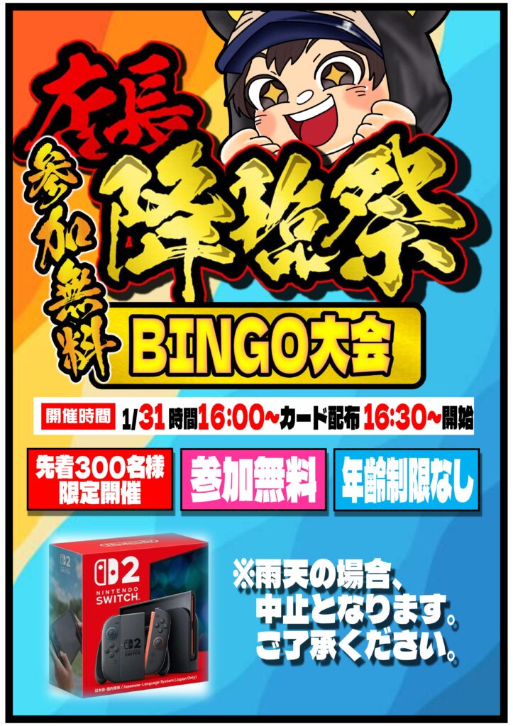 【1/31開催】店長降臨祭! 本日1/31は… 店長降臨祭【ビンゴ大会】を開催し…